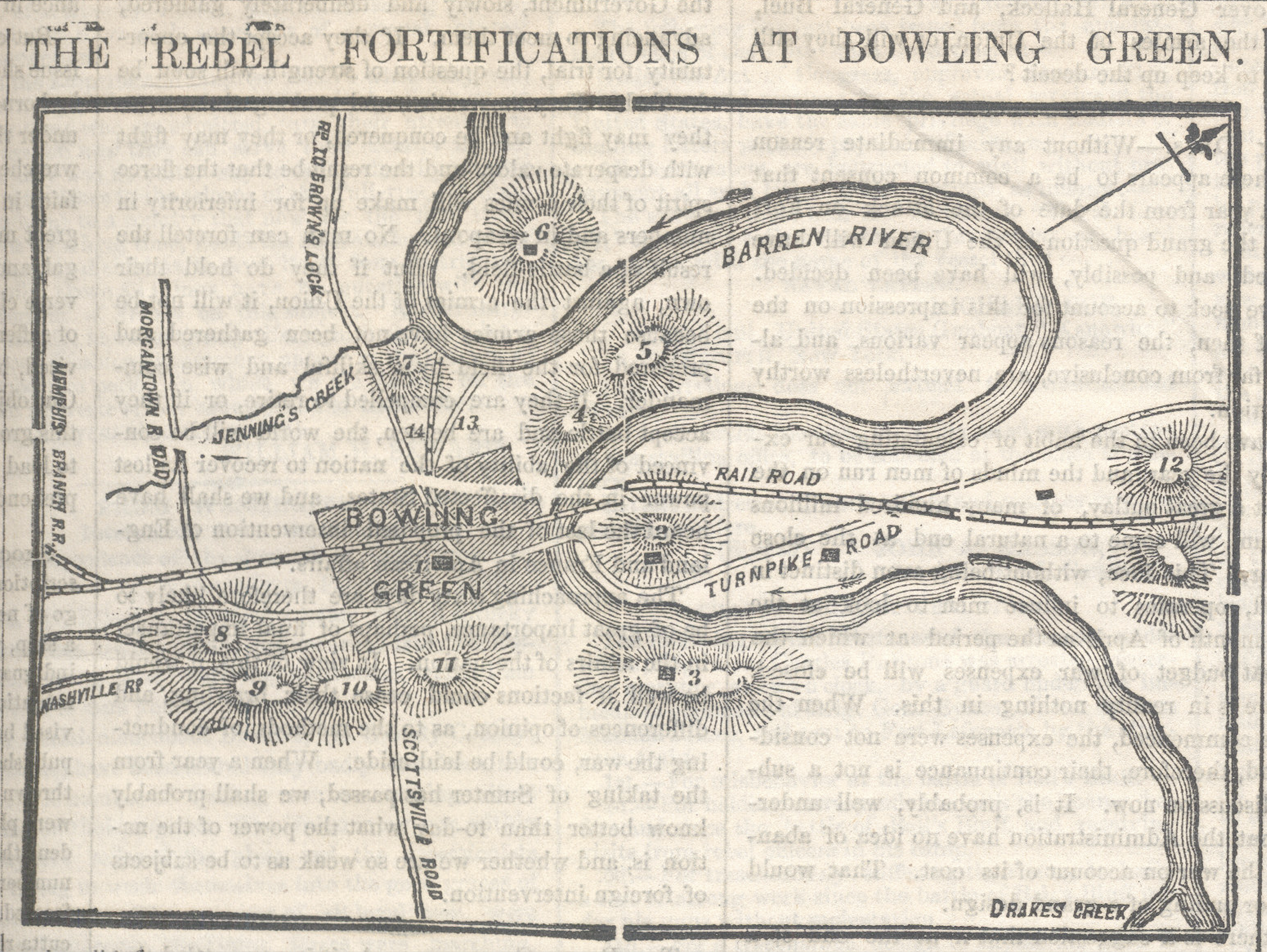 Map from the New York Weekly Journal of Commerce for Thursday, Feb. 13, 1862; showing “Rebel” fortifications near Bowling Green; the news report accompanying map shows numbered areas 1-14, they are the courthouse, Webb and Price’s Hill, Underwood and Calvert’s Hills, McGoodwin and Grider’s Hills, College and Gossom’s Hills and the roads and railroads to the river. A description of the topography, water supply and general lay of the land is noted. (Kentucky Library Research Collections)