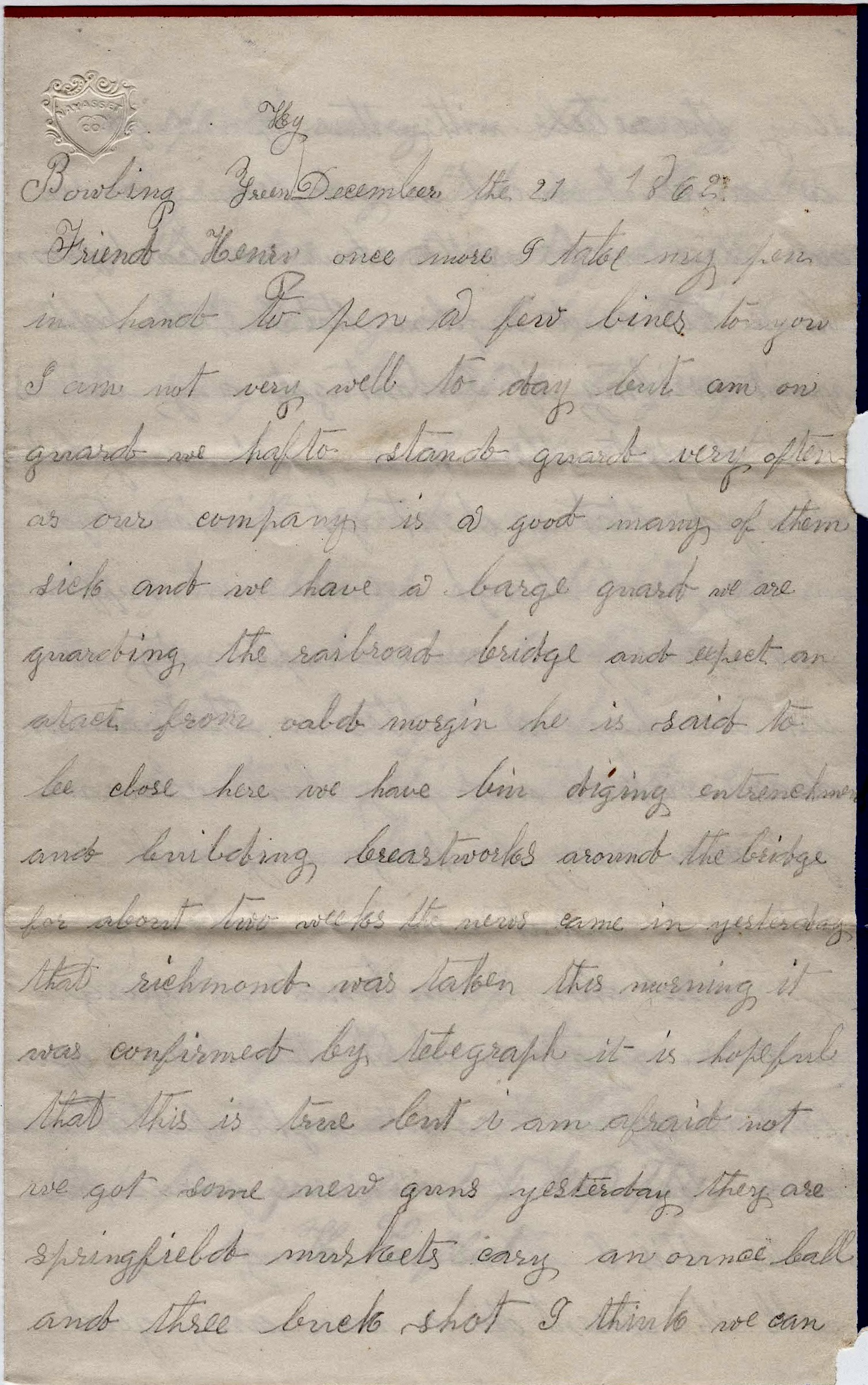 Once more I take my pen in hand to pen a few lines to you. I am not very well today but am on guard. We have to stand guard very often as our company is a good many of them sick and we have a large guard. We are guarding the railroad bridge and expect an attack from Old Morgan. He is said to be close here. We have been digging entrenchments and building breastworks around the bridge for about two weeks.