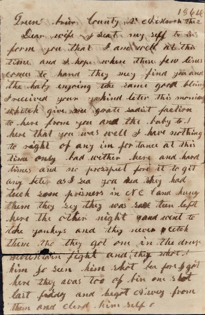 According to Muster rolls, Frank enlisted in May 1861 as a private in Co. B, 23rd North Carolina Infantry. He was severely wounded two years later in the Battle of Chancellorsville and treated at Winder Hospital in Richmond but returned to his regiment in January 1864 when this letter was penned. It was the 23rd North Carolina that took the lead in Stonewall Jackson’s immortal night march that fell upon the unsuspecting right flank of Hooker’s army. Frank’s military record does not inform us of his death but his grave marker stated that he was killed on 5 April 1865, most likely in the Battle of Amelia Springs.