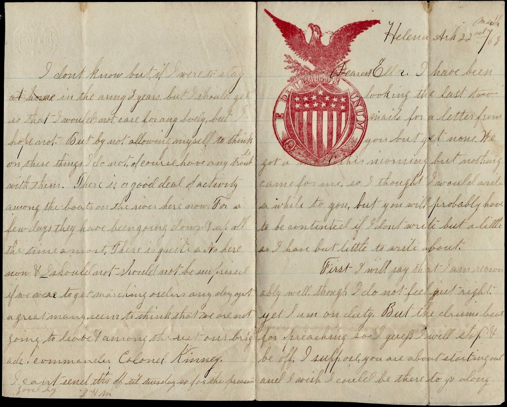 Knowing that you can but be anxious about your son, I now seat myself to talk a few moments. I cannot tell you all that has transpired since I left, nor all I have thought about you at home, but will simply give you a short account of our journey since I wrote you at St. Louis. When I then wrote, I supposed we would leave on the following morning for Helena. In this we were disappointed for we lay about on one boat and then another until Saturday evening at six o’clock when we started out on the Imperial.