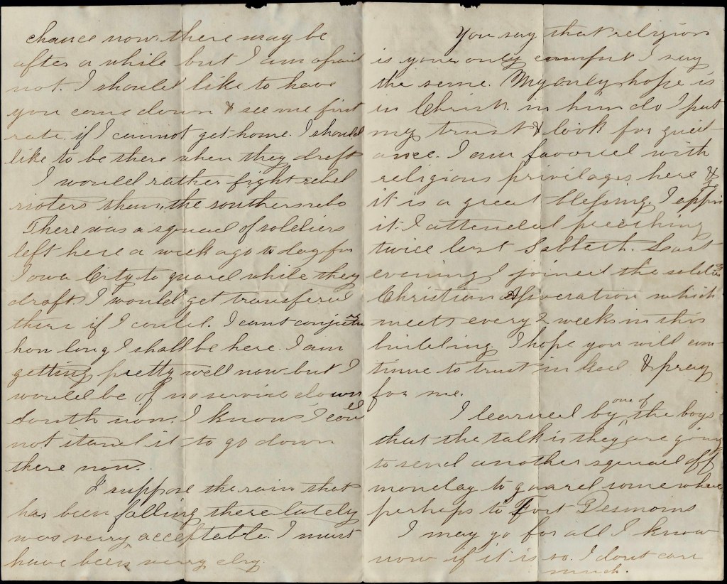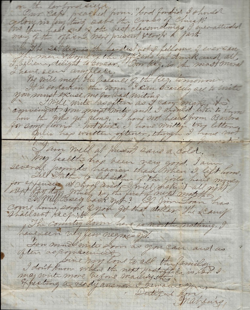 We will meet the balance of the regiment tomorrow. It is so dark in this room I can scarcely see to write. You must excuse me for bad writing. I will write as often as I can make it convenient. You must write and I should like to know how the girls get along. I have not heard from Barbara for some time—not since I have written two letters. Julia has written oftener though I have not [paper creased].