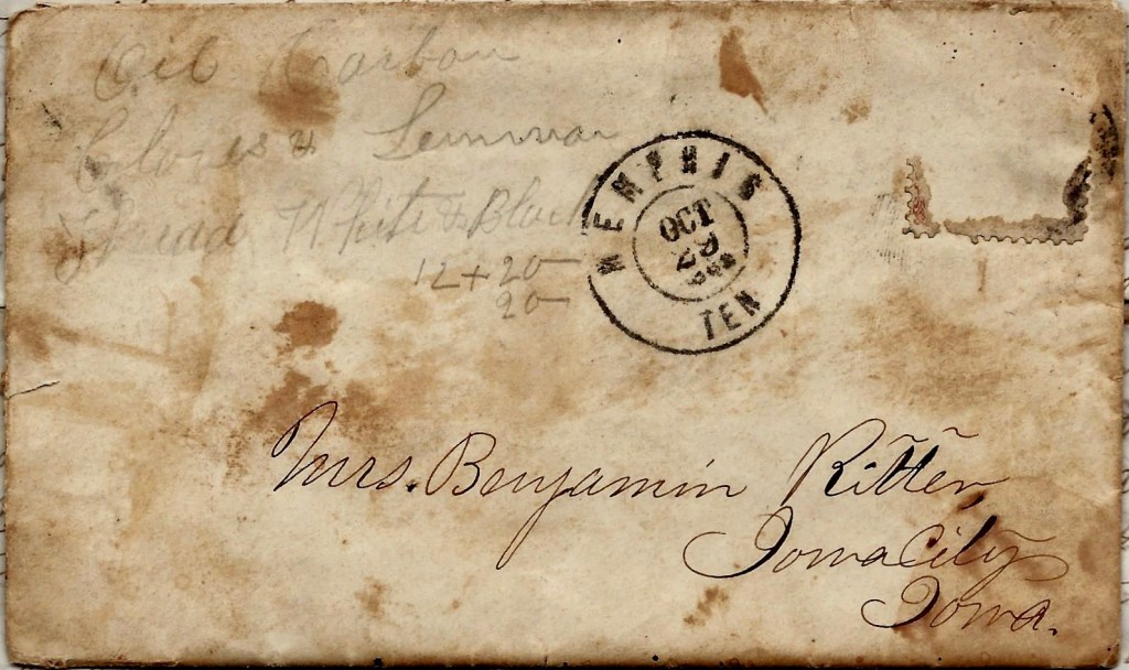 The following letters were written by Israel Marcus Ritter (1841-1864), the son of Benjamin Franklin Ritter (1814-1904) and Mary Stover (1818-1915) of Iowa City, Iowa. Marcus enlisted at the age of 21 in Co. D, 24th Iowa Infantry on 20 August 1862. He survived the Battle of Champion Hill and the siege of Vicksburg but was severely wounded by gunshot in the left arm at the 3rd Battle of Winchester, Virginia, on 19 September 1864 and died at a Winchester hospital on 4 October 1864. According to the Office of Veterans Affairs in Johnson county, Iowa, Marcus was orginally buried on the battlefield at Woods Farm but was later reburied with a military headstone at the Winchester National Cemetery, Section 76, Grave 3557.