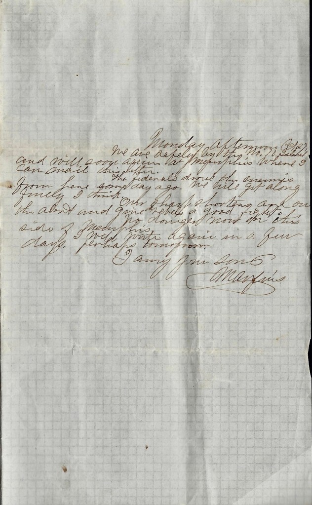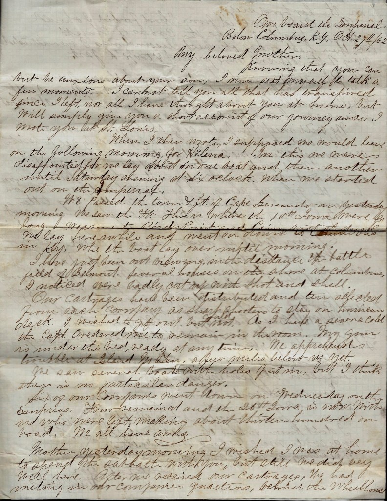 Monday afternoon, Oct. 27. We are safely by No. 10 Island and will soon arrive at Memphis where I can mail this letter. The Federals drove the enemies from here some days ago. We will get along finely I think. Our sharp shooters are on the alert and five rebels a good fight. No danger now on this side of Memphis. I will write again in a few days—perhaps tomorrow. I am you son, — Marcus
