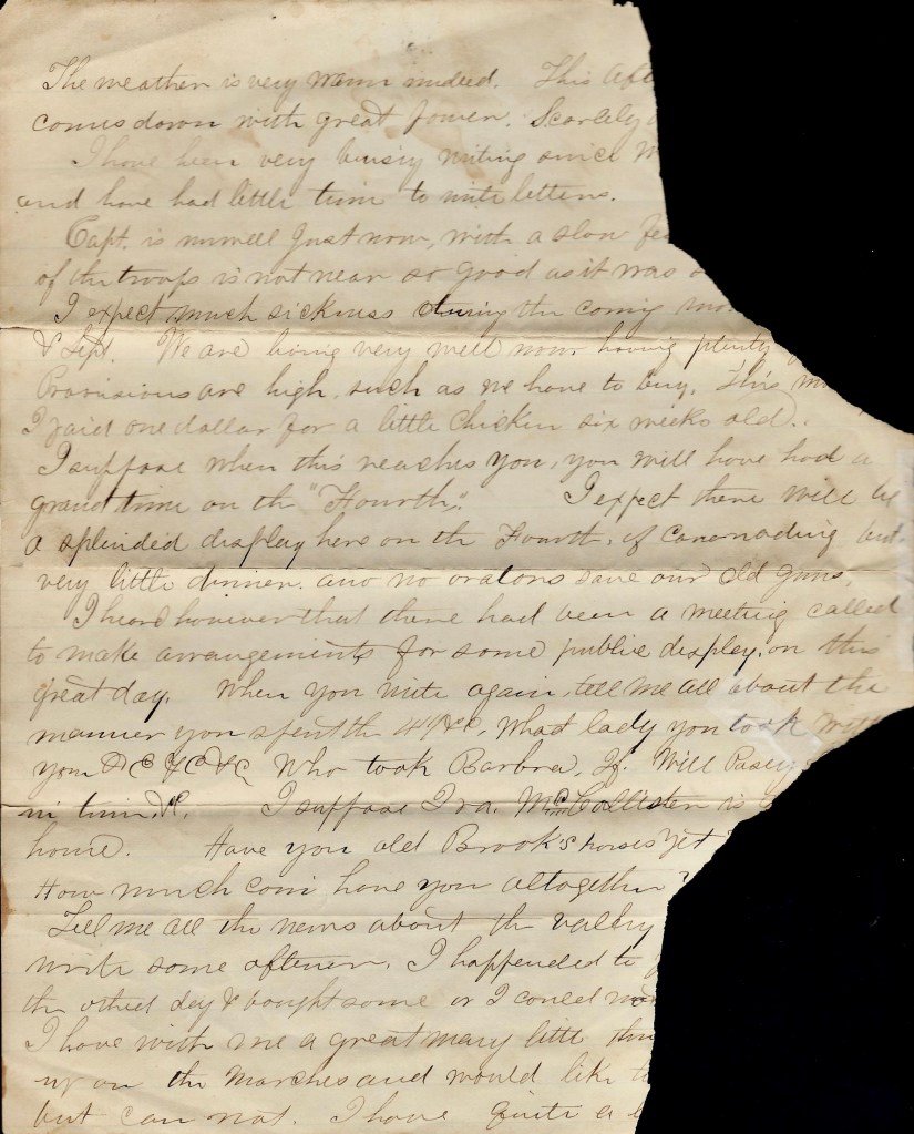 Capt. [Casebeer] is unwell just now with a slow fever. Some of the troops is not near so good as it was so [paper missing]. I expect much sickness during the coming months of August and September. We are living very well now, having plenty [paper missing]. Provisions are high, such as we have to buy. This morning I paid one dollar for a little chicken six weeks old. I suppose when this reaches you, you will have had a grand time on the “Fourth.” I expect there will be a splendid display here on the Fourth, of cannonading, but very little dinner and no orations save our old guns.
