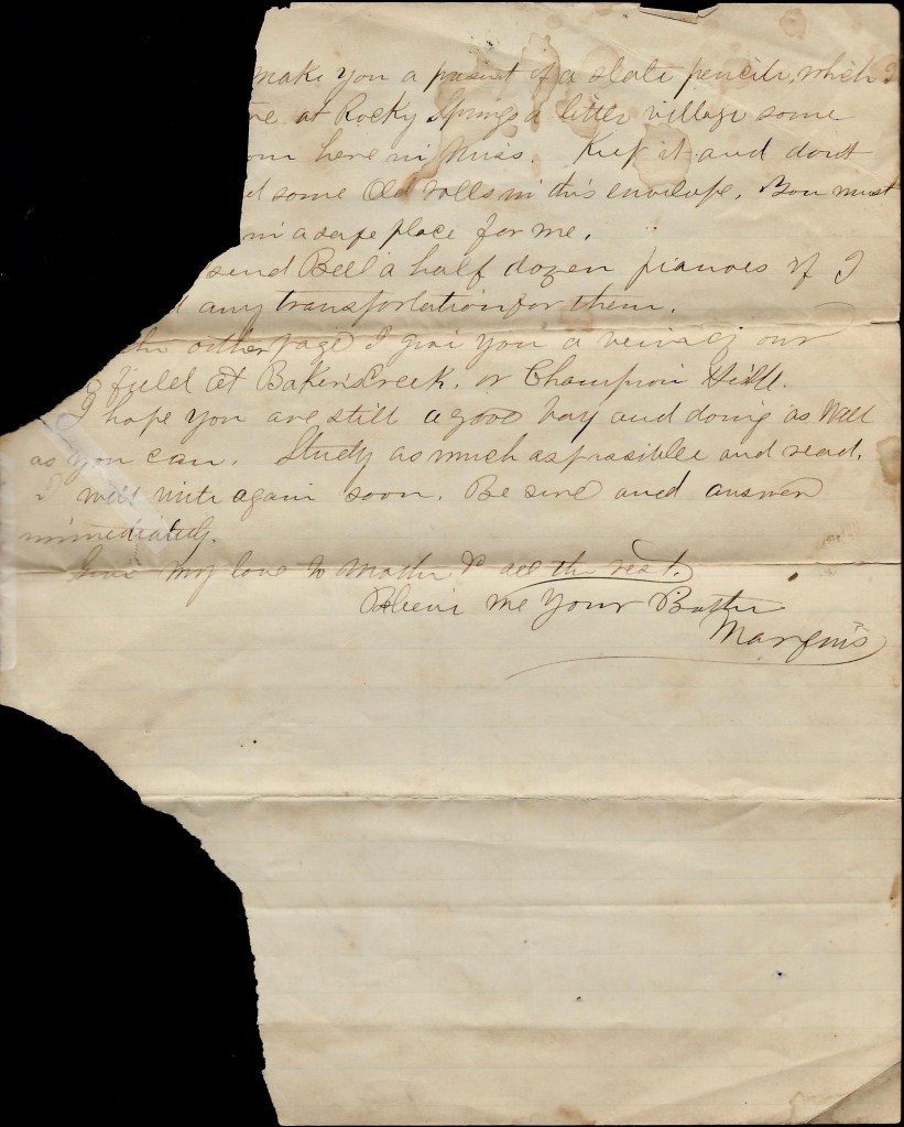 I heard however that there had been a meeting called to make arrangements for some public display on the great day. When you write again, tell me all about the manner you spent the 4th, &c. What lady you took with you, &c. &c. Who took Barbara? If Will Posey [paper missing] in turn, &c. I suppose Ira McCollister is at home. Have you old Brooks’ horses yet? How much corn have you altogether? Tell me all the news about the valley. Write some oftener. I happened to [paper missing] the other day & bought some or I could [paper missing]. I have me a great many little [paper missing] up on the marches and would like to [paper missing] but can not. I have quite a [paper missing]…make you a present of a slate pencil which I [paper missing] at Rocky Springs—a little village some [paper missing] from here in Mississippi. Keep it and don’t [paper missing] sole Old rolls in this envelope. You must keep it in a safe place for me…
