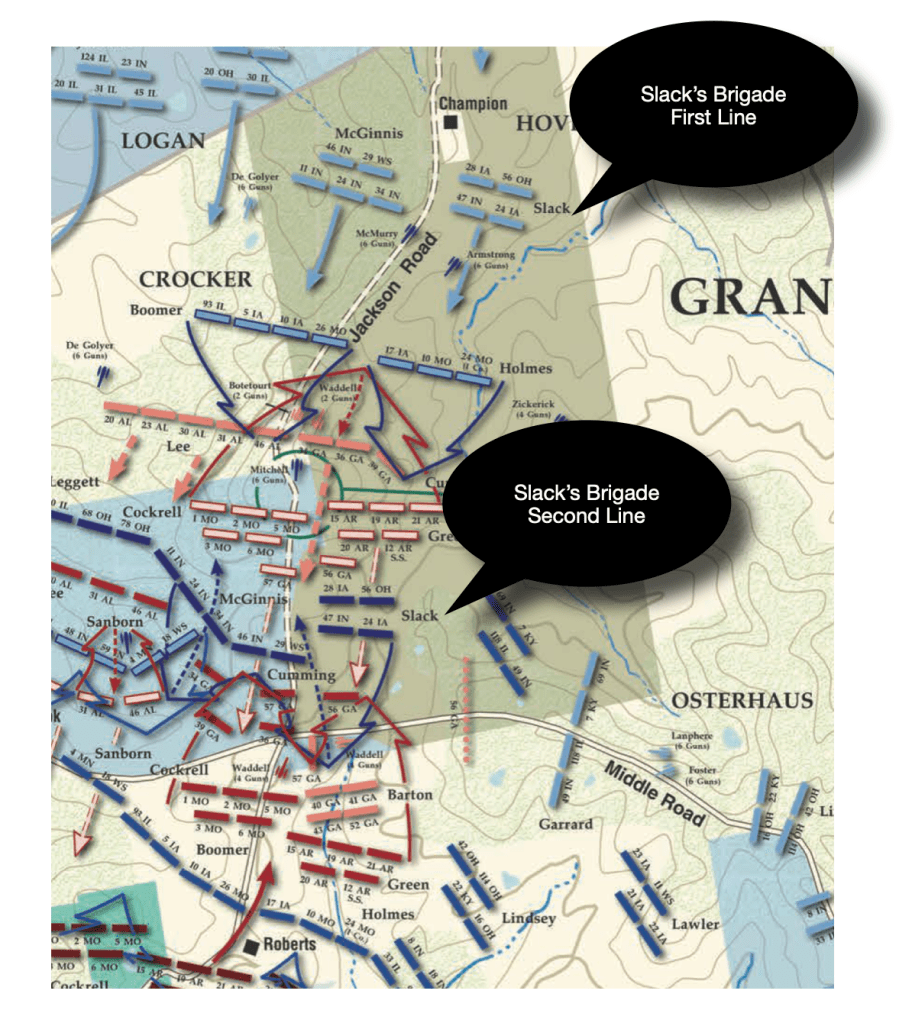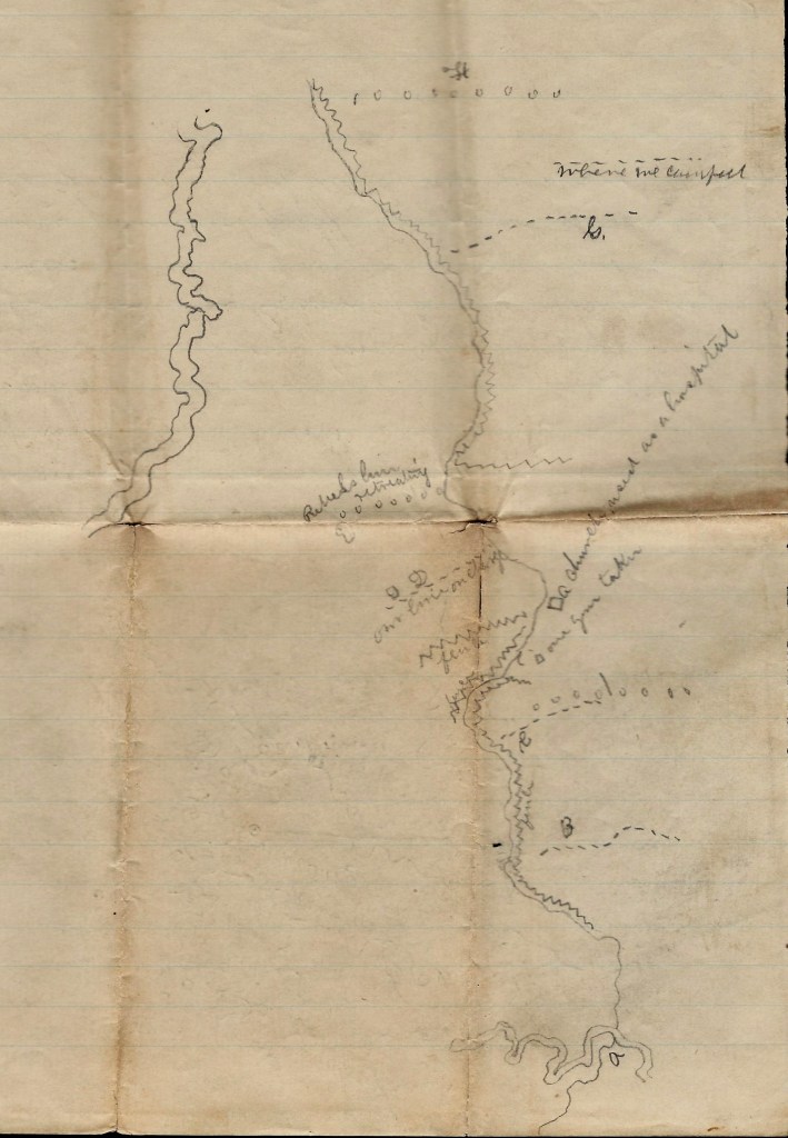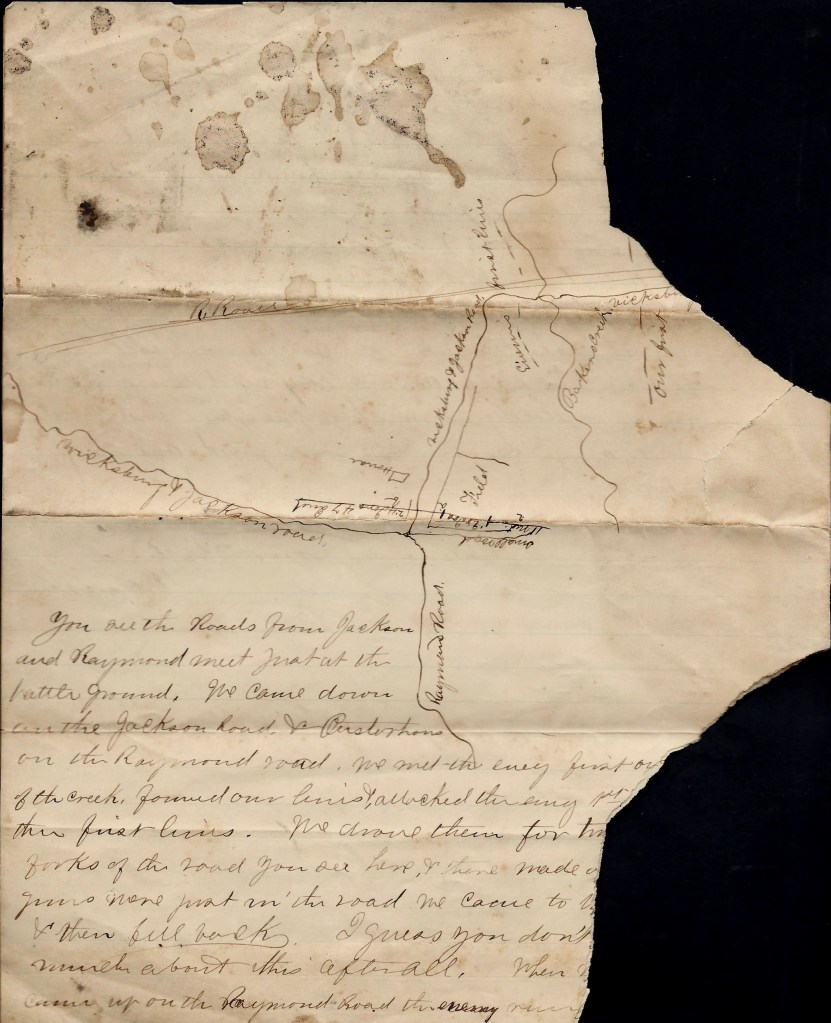 You see the roads from Jackson and Raymond meet just at the battleground. We came down on the Jackson Road & Osterhaus on the Raymond Road. We met the enemy first on [paper missing] of the creek, formed our lines, and attacked the enemy 1st [paper missing] their first lines. We drove them for two [paper missing] forks of the road you see here & there made [paper missing] guns were just in the road we came to [paper missing] and then fell back. I guess you don’t [paper missing] much about this after all. When [paper missing] came up on the Raymond Road, the enemy run [paper missing].