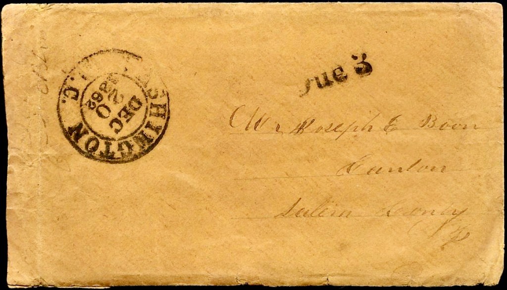 Direct your letter to William H. Carr in care of Capt. Ward, Co. D, 24th Regt. N. J. Vols., Washington D. C. Write soon