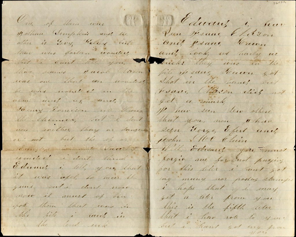 Lizzie, I like a soldier’s life. I get plenty to eat. We get beef, pork, ham, rice, beans, molasses, coffee, sugar, soft bread. So you see that i get enough to eat. Today the tent is very busy a writing home to their folks to let them know how they are getting along. I have wrote a letter and sent it to Anney Hairtage and she has not sent me an answer. When I don’t get any letters, I shall stop writing. Give my love to Sally and your mother and Jack and tell Jack he must write to me. I must stop writing for the present. I remain your friend. Goodbye. — William H. Carr