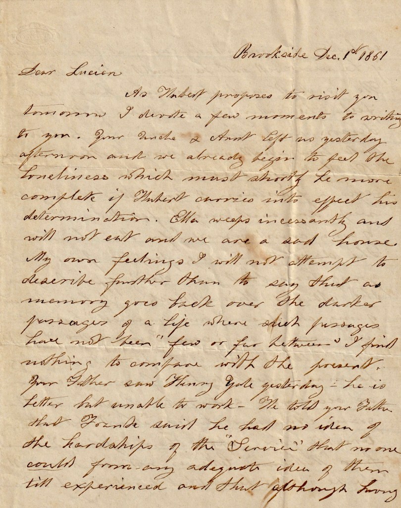 As Hubert proposes to visit you tomorrow, I devote a few moments to writing to you. Your Uncle and Aunt left us yesterday afternoon and we already begin to feel the loneliness which must shortly be more complete if Hubert carries into effect his determination. Ella 1 weeps incessantly and will not eat and we are a sad house. My own feelings I will not attempt to describe further than to say that as memory goes back over the darker passages of a life where such passages have not been “few or far between,” I find nothing to compare with the present.