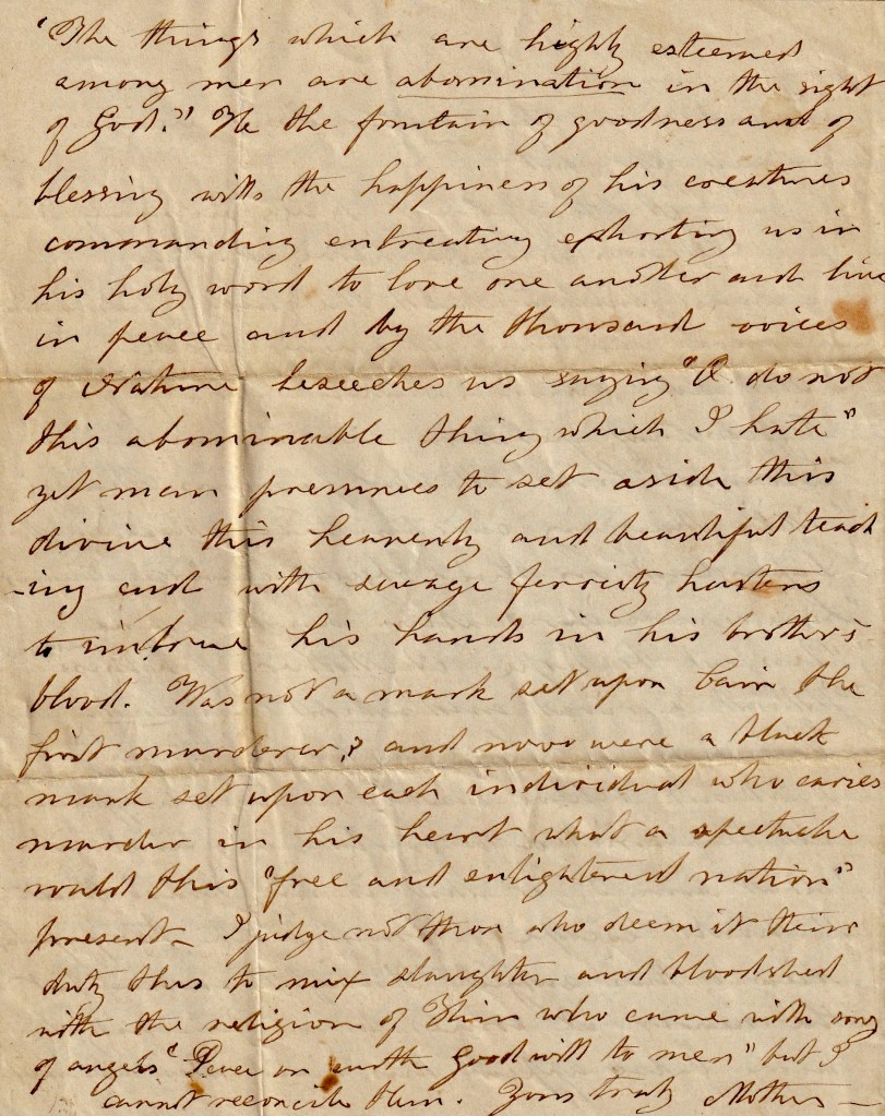 But I will yet hope as long as I may. I will not believe that this terrible affliction will be permitted to overtake us and yet, “what am I or what is my house” that I should escape. Could I take the popular view of this subject, I might endure, but the nearer it comes to me personally, the more false appears this view. Rest assured “the things which are highly esteemed among men are abomination in the sight of God.” He the fountain of goodness and of blessing wills the happiness of his creatures commanding, entreating, exhorting us in His holy word to love one another and live in peace and by the thousand voices of Nature, beseeches us saying, “Oh, do not this abominable thing which I hate.” Yes men presumes to set aside this divine, this heavenly and beautiful teaching and with savage ferocity hastens to imbue his hands in his brother’s blood. Was not a mark set upon Cain, the first murderer? And now were a black mark set upon each individual who carries murder in his heart, what a spectacle would this “free and enlightened nation” present.