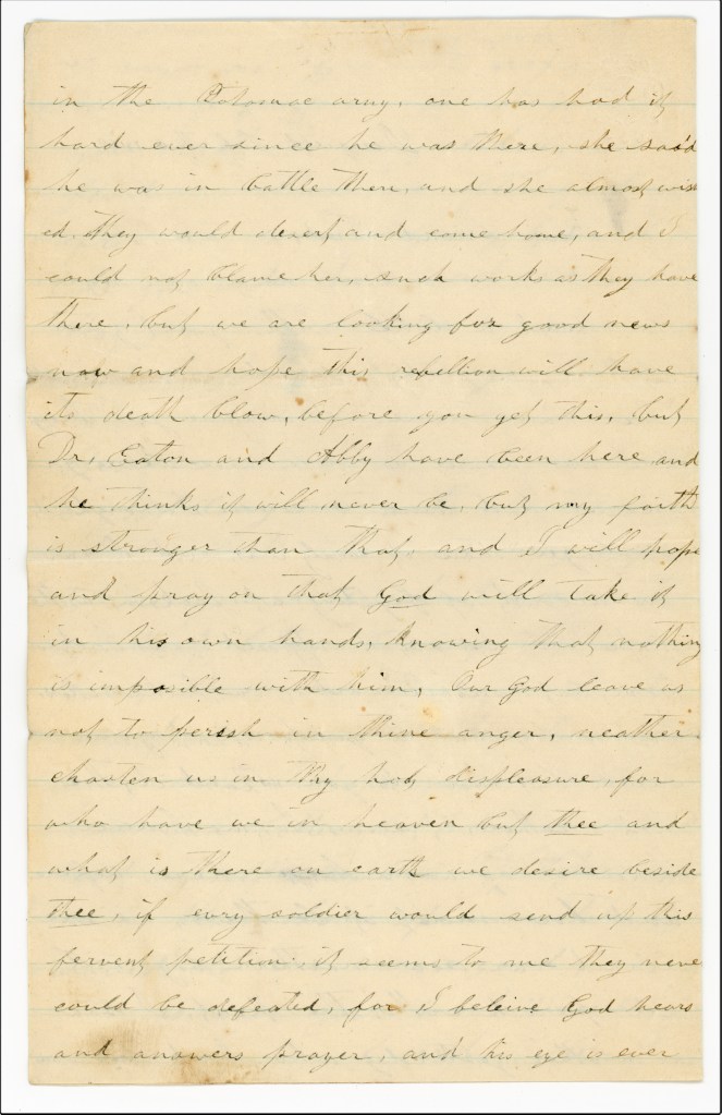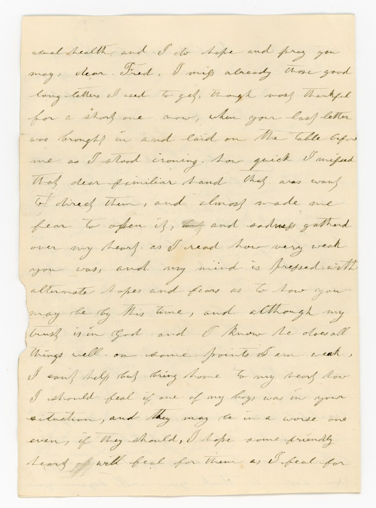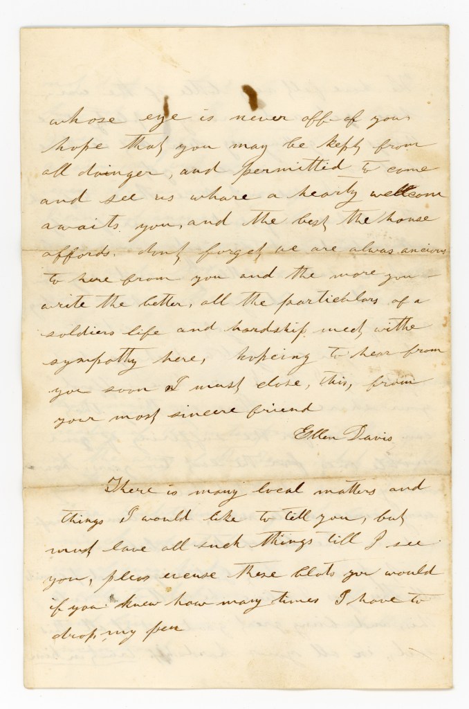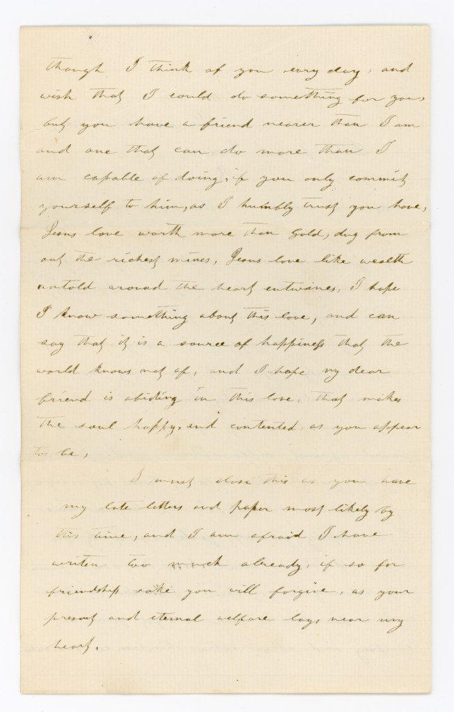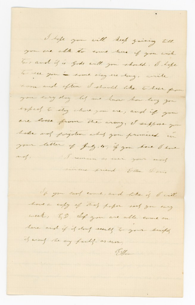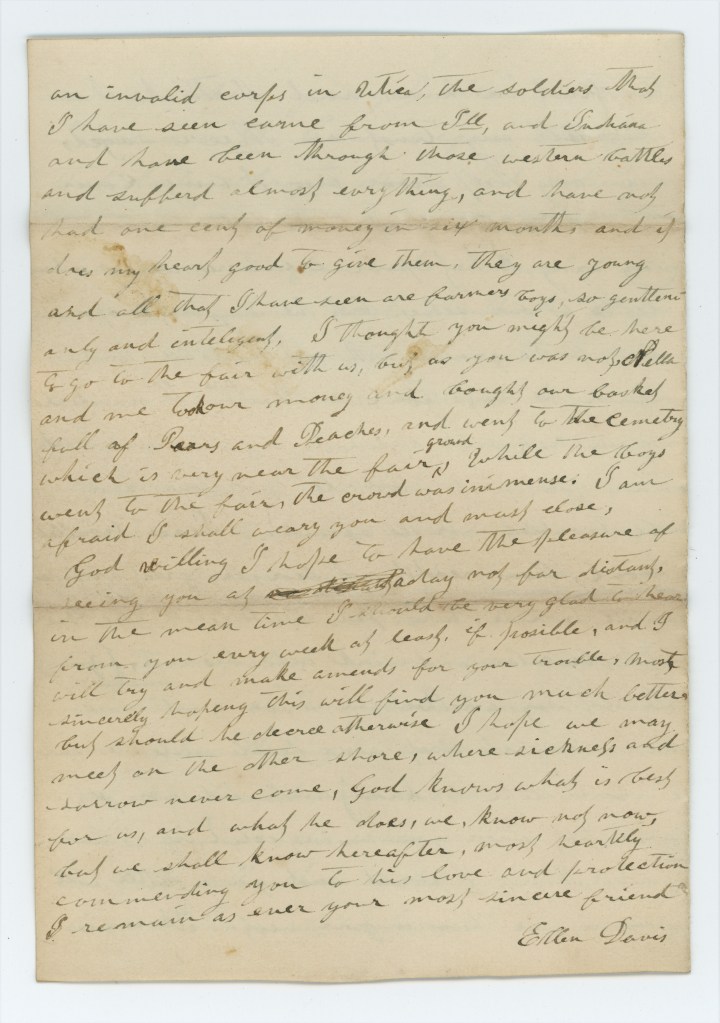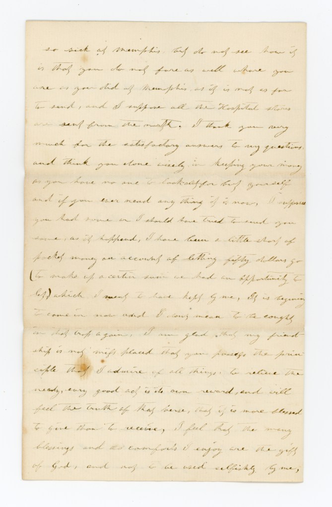 The sick, wounded and crippled are all around us. War is a horrible thing. I had intended to close my letter with this page but as I have just heard a rumor that we are to go to Memphis soon, I will fill up the fourth page.Our regiment is in most miserable condition to meet the enemy. Poorly supplied with poor guns and many of them unfit for us. God have mercy on us if we have to go into battle in our present condition.