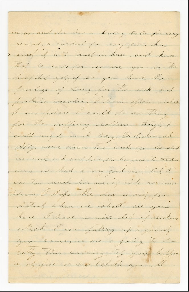 I have frequently heard the Dr. speak of New Orleans as a very healthy place at this season of the year & for that reason am induced to think he will stay in the city unless on account of being with his brother he should prefer to to to Memphis if he could get an order to that effect. Give my respect to Mrs. Hastings. It has been some time since I have received any word from you. I suppose of course that you and the children are well & enjoying the winter, cold as it may be. It is not very warm here yet. Since being here we have had a stiff sea breeze, generally cool with occasionally warm streaks intermixed. The boys say they have seen peas in blossom in the gardens. My health is good but every day makes me more and more tired of soldiering. With love and kisses for yourself and the children, I remain as ever yours, — O. Whitney