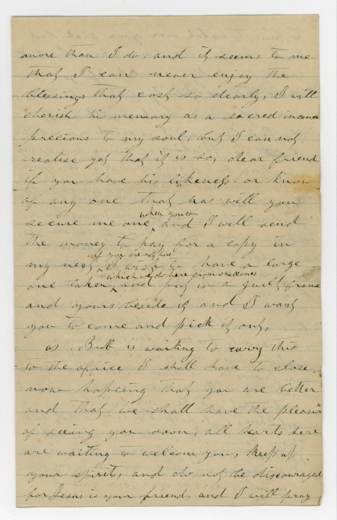 I wish you would send me F. N. Shurtleff’s letter as soon as possible. If it is what I have looked for, I am more than usually interested. I should like to hear from Ed again but I am afraid it will be some time first. I don’t know but he may be disappointed about the Thompson notes. I sent him two two notes I had taken up from which he could see the amounts, yet I am afraid he had the impression that I had taken up the large note that Thompson still holds against him and being so disappointed does not feel inclined to write me anymore. You know he owes me $100. It is very possible he would not have sent that if he had not supposed I was paying off the large note. I never gave him to understand or never intended to do so that I was paying or should undertake to pay it.
