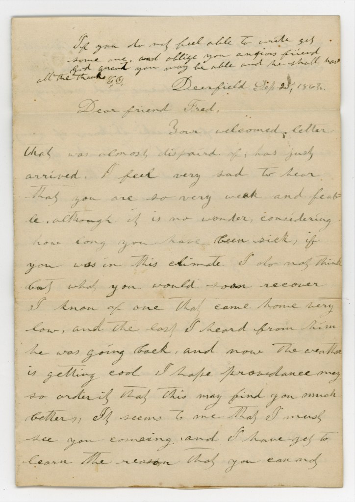 Yesterday I was gratified at the reception of three of your letters dated August 30th, September 6th, and September 13th. It had been nearly or quite a month since receiving any intelligence from you. I was anxious to learn whether you have received the money I sent by the chaplain although I had previously been informed that the money was left at Independence [Iowa].