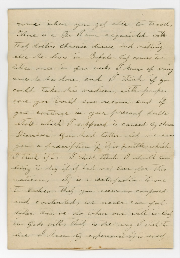 My health is good. I hope to hear from you & that you & mother & all are well. I have heard nothing of Olive in a long time. With love to Ma and all the rest, I remain with the greatest respect your affectionate son, — Otis Whitney