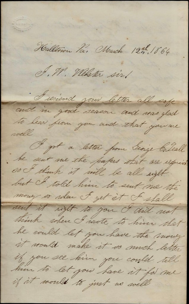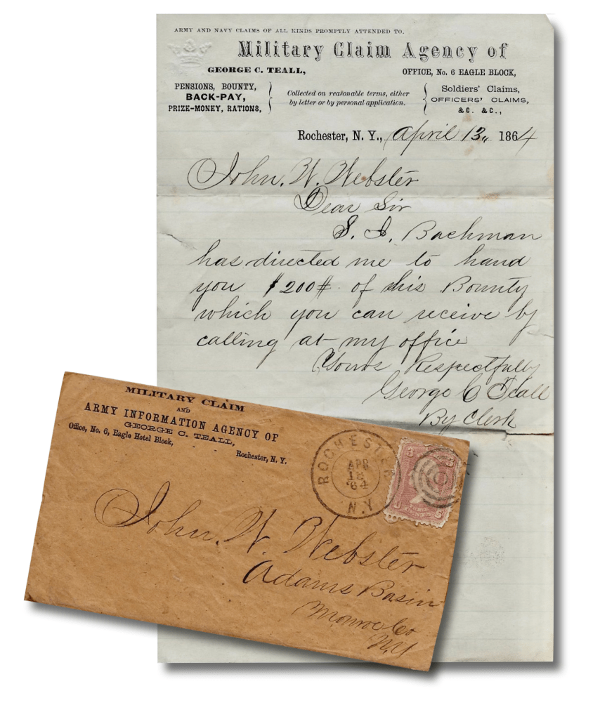 Mr. Webster, I have not got my bounty yet and if you please, will you see to get it for me for you are the only friend that I have got. If you can get it for me, I should like it very much for I got a letter from my sister and she is sick. I should like to send her some of it if I got it. You go to Rochester very often and you go and see George C. Teal, Commissioner of Deeds on Buffalo Street in the Eagle Block. He swore me in. I think he can tell you something about it. Write to me as soon as you can for I am anxious to hear about it.