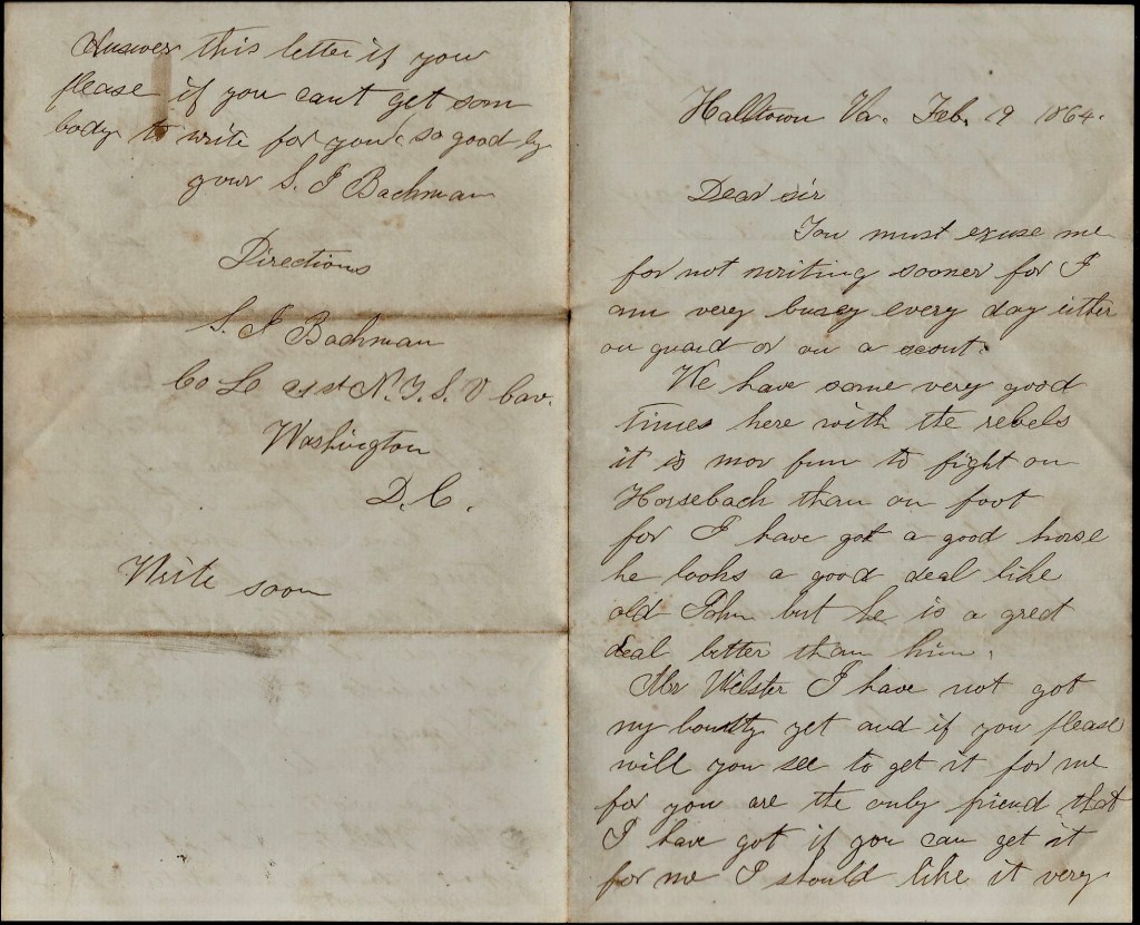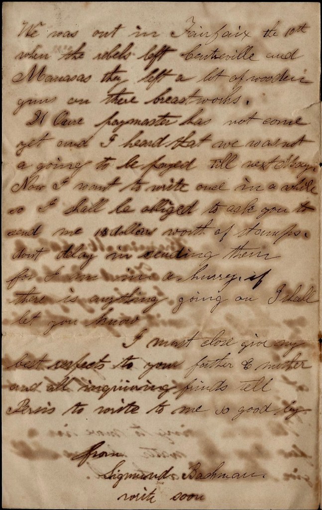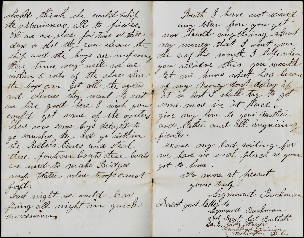 Direct your letter to Sigmond Bachman, 27th Regt., Col. Bartlett, Co. E, Capt. [George G.] Wanzer, Franklin’s Division, Washington D. C.
