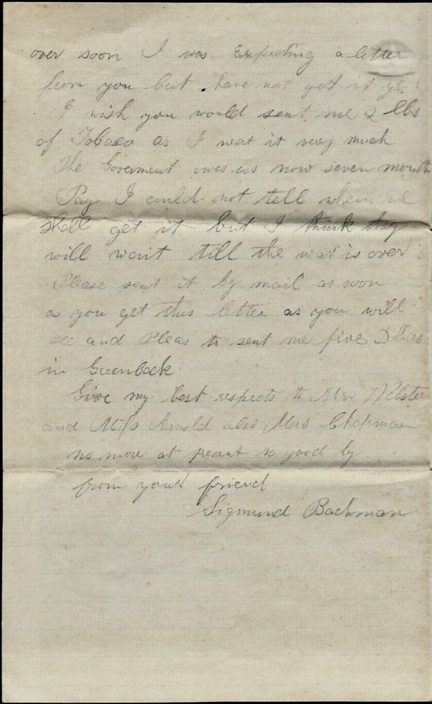I have not much more to write. Remember me to Mr. & Mrs. Chapman and also to Miss Arnold. Remember me to Mrs. Webster. I must close so goodbye. Write soon. I am, — Sigmund J. Bachman