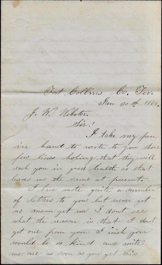 I have wrote one letter to Mrs. Webster but got no answer yet. I don’t know whether she got it or not. Answer this letter if you please. If you can’t, get somebody to write for you. So goodbye.