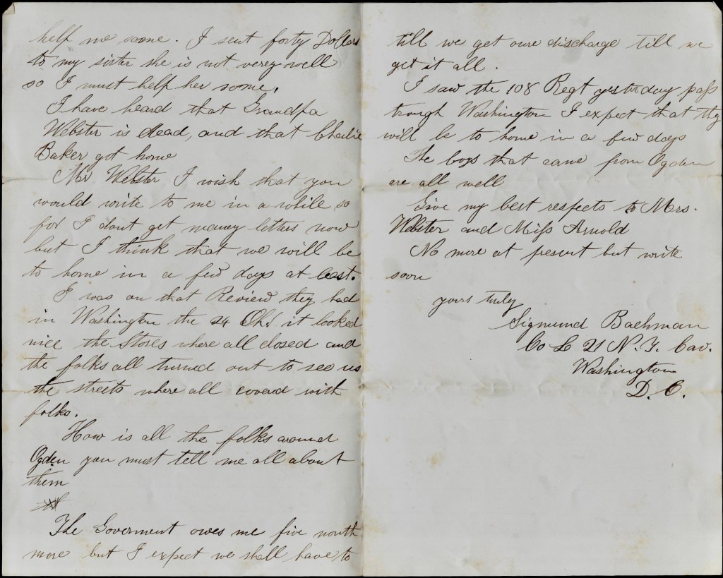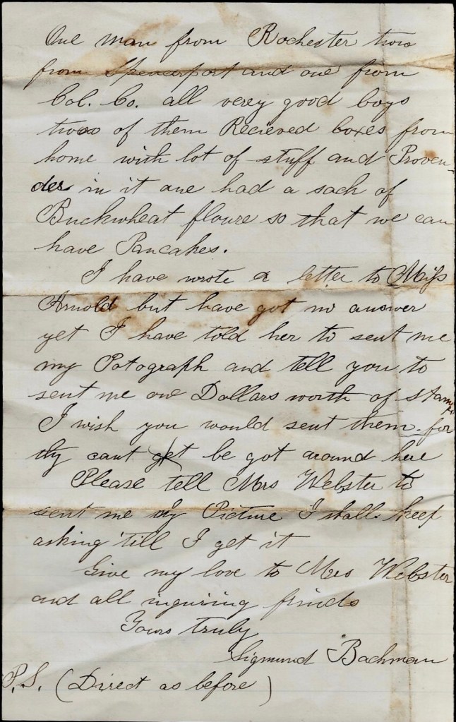 The following Civil War letters were written by German (Jewish) emigrant Sigmond Bachman (1840-1911). He first appears in US Census records in 1860 enumerated in the household of John West Webster (1808-1889) and his wife, Esther Arnold (1813-1888) of Ogden, Monroe county, New York, where he was a hired laborer on Webster’s farm. Also living in her father’s home at that time was 23 year-old Ruth Webster (1837-1904). Ruth and her father were the recipients of these letters. Ruth married Russell Chapman (1824-1882) on 1 October 1863.