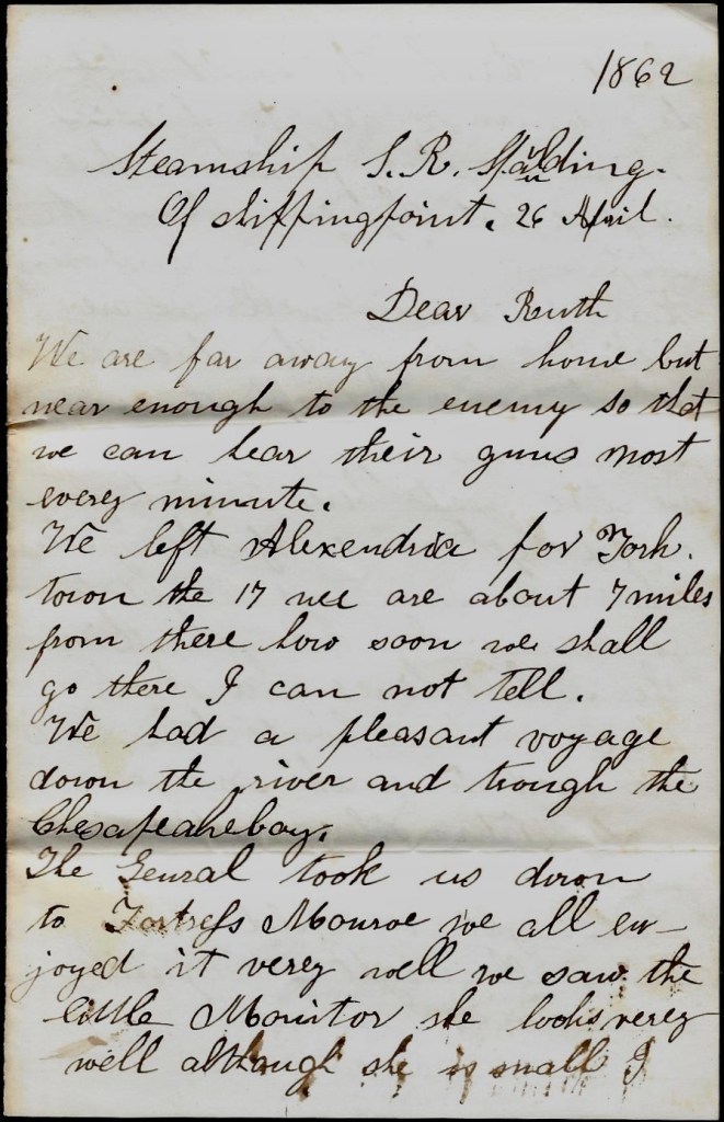We are far away from home but near enough to the enemy so that we can hear their guns most every minute. We left Alexandria for Yorktown the 17th. We are about 7 miles from there. How soon we shall go there, I cannot tell. We had a pleasant voyage down the river and through the Chesapeake Bay.