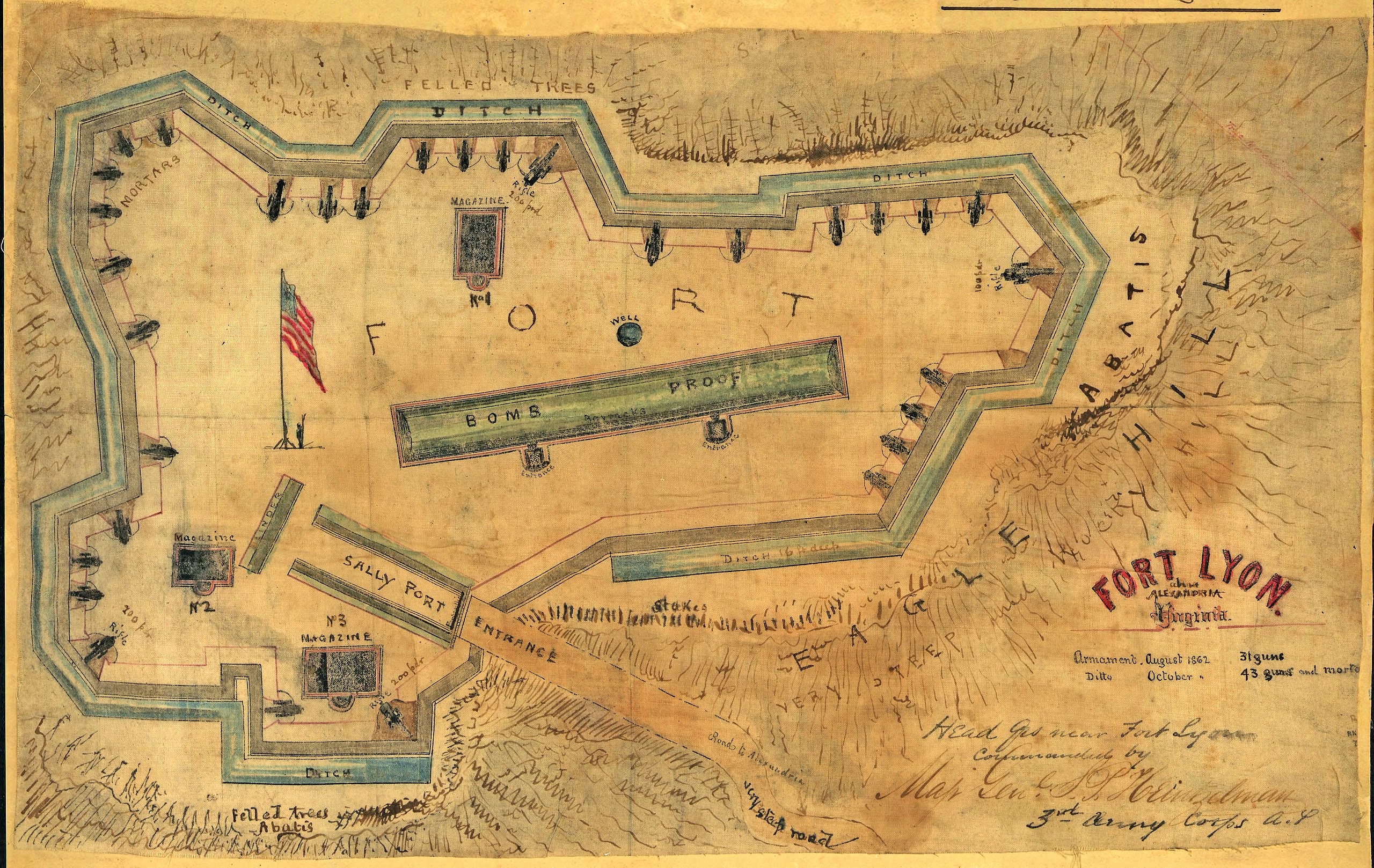 The map by Sneden, Robert Knox, 1832-1918, is a close up drawing of Fort Lyon located on Ballenger’s Hill south of Hunting Creek, and Cameron Run. From its position on one of the highest points south of Alexandria, the fort overlooked Telegraph Road, the Columbia Turnpike, the Orange and Alexandria Railroad, the Little River Turnpike, and the southern approaches to the city of Alexandria, the largest settlement in Union-occupied Northern Virginia.