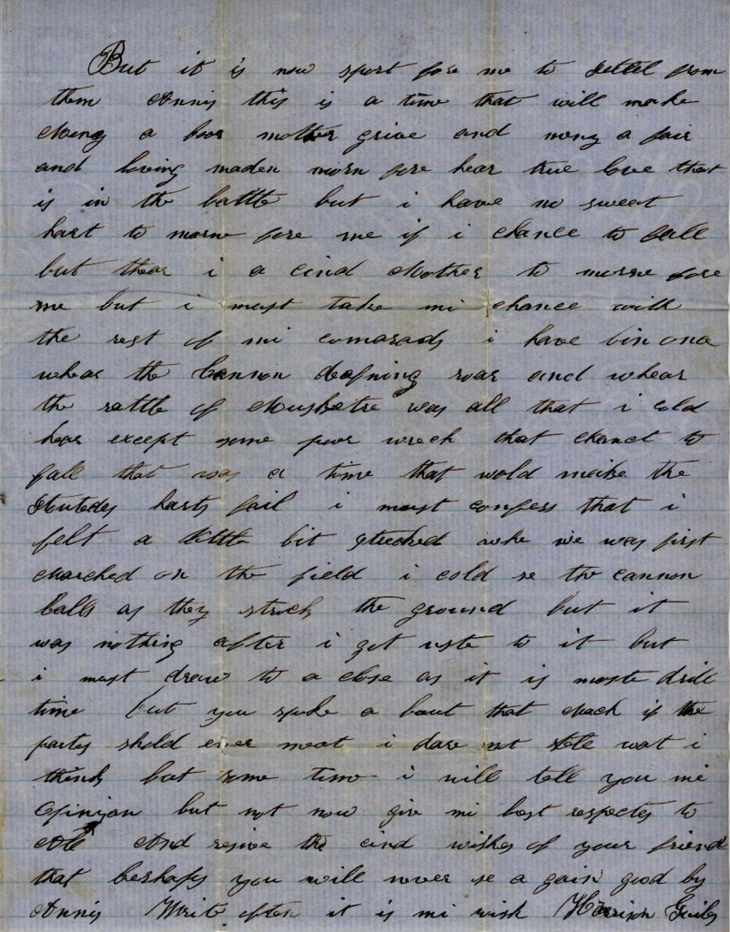 Annis, this is a time that will make many a poor mother grieve and many a fair and loving maiden mourn for her true love that is in the battle. But I have no sweetheart to mourn for me if I chance to fall. But there is a kind mother to mourn for me but I must take my chance with the rest of my comrades. I have been once where the cannon’s deafening roar and where the rattle of musketry was all that I could hear except some poor wretch that chanced to fall. That was a time that would make the sturdy hearts fail. I must confess that I felt a little bit wretched when we first marched on the field. I could see the cannon balls as they struck the ground but it was nothing after I got used to it.