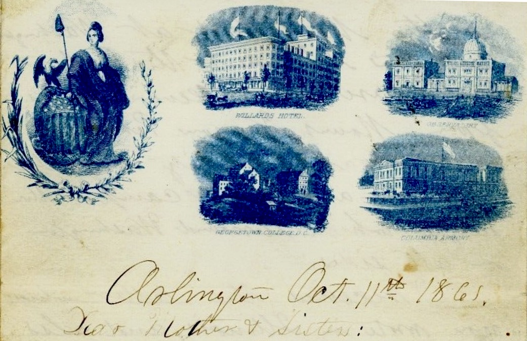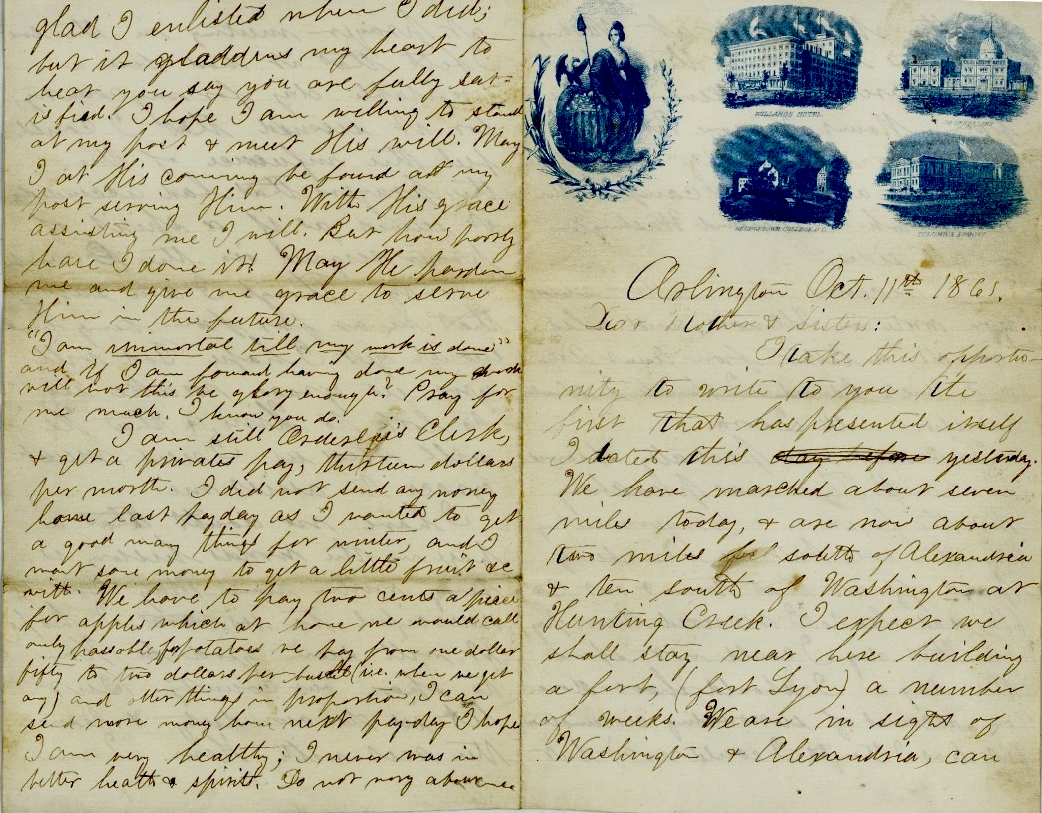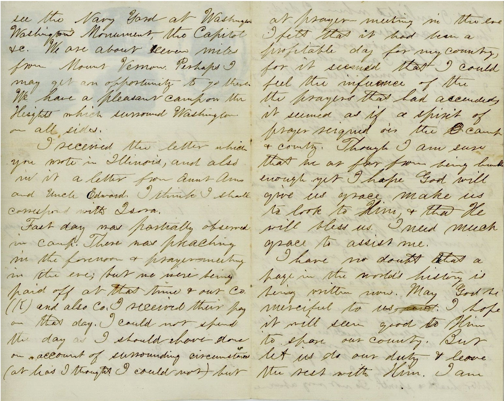 I take this opportunity to write to you. It’s the first that has presented itself. I dated this yesterday. We have marched about seven miles today & are now about two miles south of Alexandria and ten south of Washington at Hunting Creek. I expect we shall stay near here building a fort (Fort Lyon) a number of weeks. We are in sight of Washington & Alexandria, can see the Navy Yard at Washington, Washington Monument, the Capitol, &c. We are about seven miles from Mount Vernon. Perhaps I may get an opportunity to go. there. We have a pleasant camp on the heights which surround Washington on all sides.
