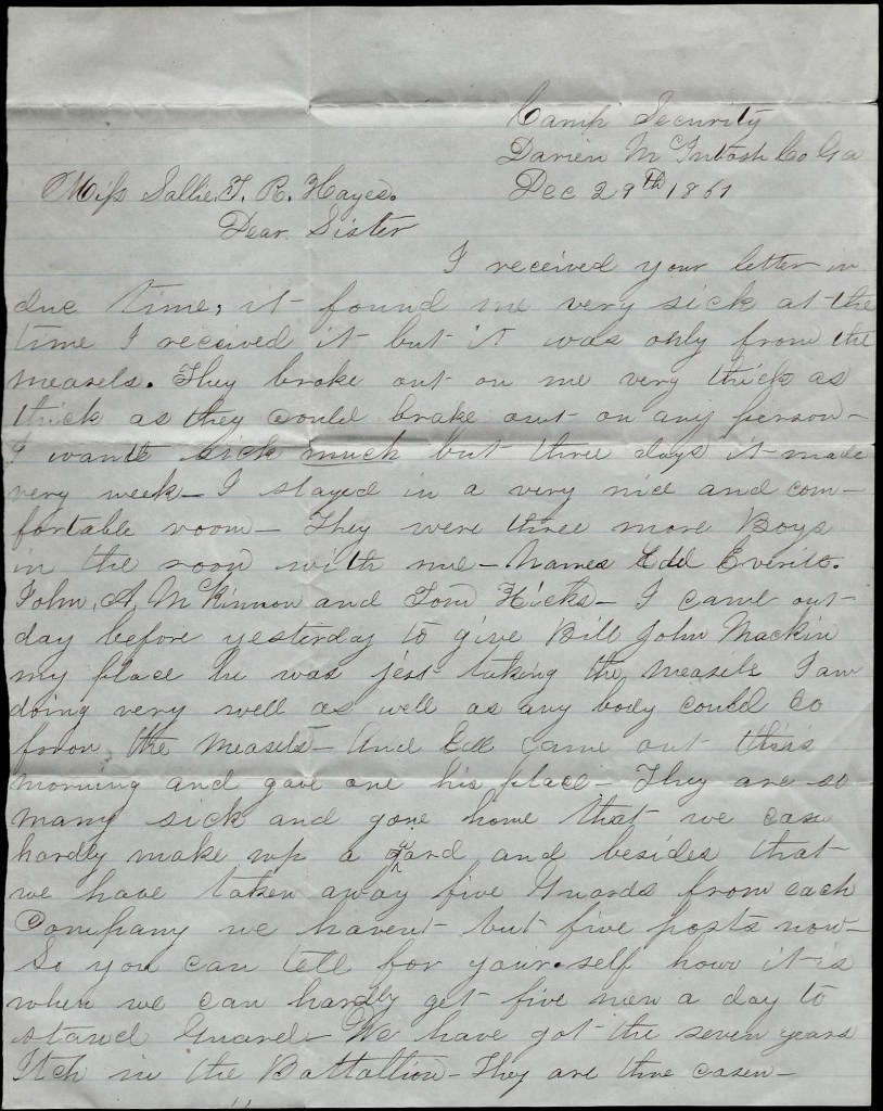 I received your letter in due time. It found me very sick at the time I received it but it was only from the measles. They broke out on me very thick—as thick as they could break out on any person. I wasn’t sick much but three days. It made me very weak. I stayed in a very nice and comfortable room. There were three more boys in the room with me—names Ed Everett, John A. McKinnon, and Tom Hicks. I came out day before yesterday to give Bill John Mackin my place. He was just taking the measles. I am doing very well—as well as anybody could do from the measles. And Bill came out this morning and gave one his place. There are so many sick and gone home that we can hardly make up a guard and besides that, we have taken away five guards from each company. We haven’t but five posts now so you can tell for yourself how it is when you can hardly get five men a day to stand guard.