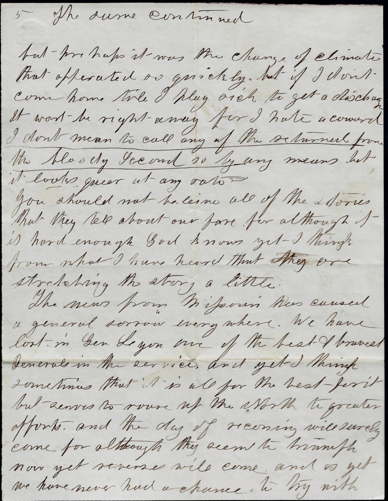 The news from Missouri has caused a general sorrow everywhere. We have lost in General Lyon one of the best and bravest generals in the service, and yet I think sometimes that it is all for the best for it but seems to rouse up the North to greater efforts and the day of reckoning will surely come for although they seem to triumph now, yet reverses will come and as yet as have never had a chance to try with anything like an even chance.