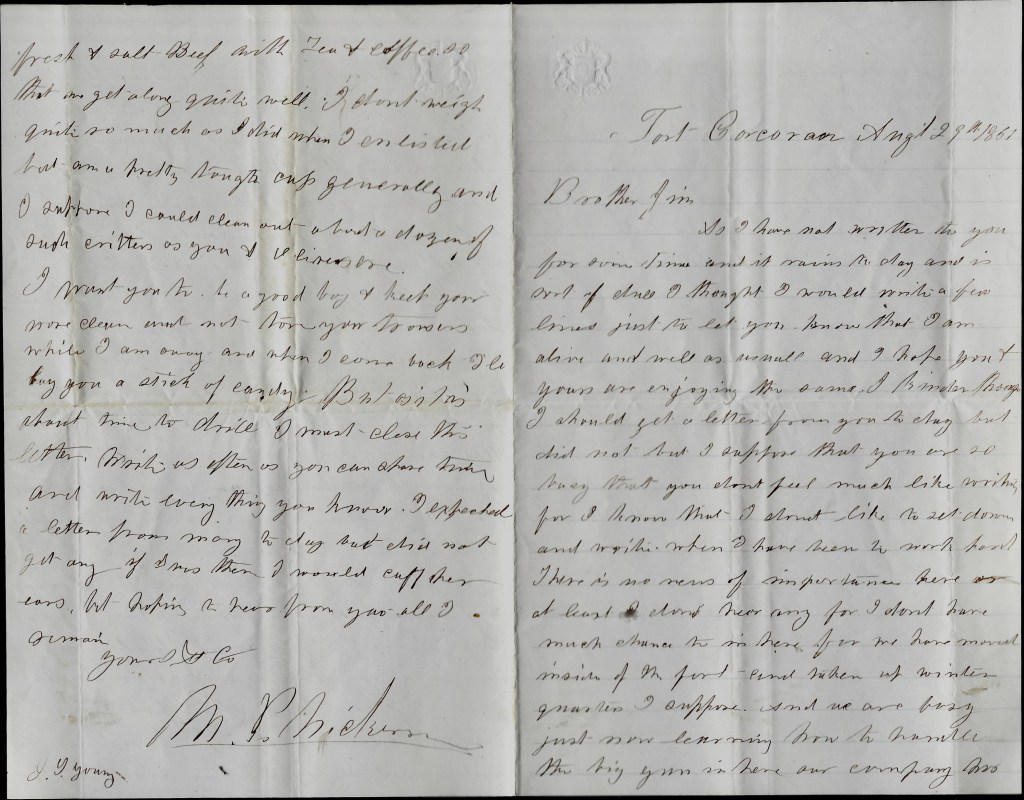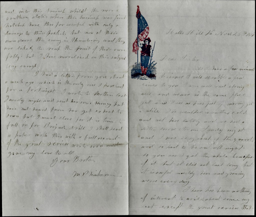 I want you to be a good boy & keep your nose clean and not tear your trousers while I am away and when I come back, I’ll buy you a stick of candy. But as it is about time to drill, I must close this letter. Write as often as you can spare time and write everything you know. I expected a letter from Mary today but did not get any. If I was there I would cuff her ears, but hoping to hear from you all, I remain yours, &c., — M. P. Nickerson