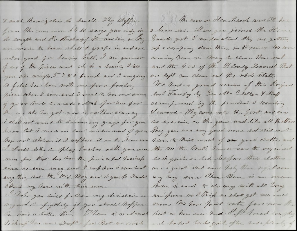 We had a grand review of this brigade last Tuesday by Gen. McClellan & staff accompanied by the President & Secretary Seward. They came into the fort and saw us exercise the guns and like all the others, they gave us a very good name but still not seem to think much of our good clothes. And to tell the truth, I never saw the regiment look quite so bad before. Their clothes are a great deal more holy than righteous. Anyway, since then, there is an order been signed to do away with all grey uniforms so I think we shall get new ones soon.