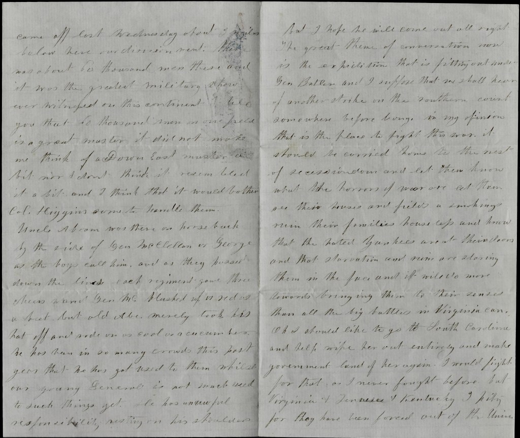 Uncle Abram [Lincoln] was there on horseback by the side of Gen. McClellan, or George as the boys call him, and as they passed down the lines, each regiment gave three cheers and Gen. Mac blushed up as red as a beet, but Old Abe merely took his hat off and rode on as cool as a cucumber. He has been in so many crowds this past year that he has got used to them whilst our young General is not much used to such things yet. Abe has an awful responsibility resting on his shoulders but I hope he will come out all right.