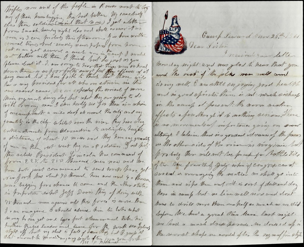 Mary wrote that Oliver had written the same day that you did but I have not anything from him. I got one last night from David. I should like to have been down there to have gone to the fires. I guess that you have got some secessionists down there. I think you had better organize a regiment right off and station some picket guard and send out patrols or you may see some morning when you get up the rebel flag flying over your heads and then don’t say that I did not warn you. But then, I suppose you don’t know much about war down there. If you had been encamped within two miles of Virginia and within sight of Alexandria and Fairfax Court House and also Arlington Heights for a fortnight, you would feel like fighting. I have been so mad for a week that I did not know what to do.