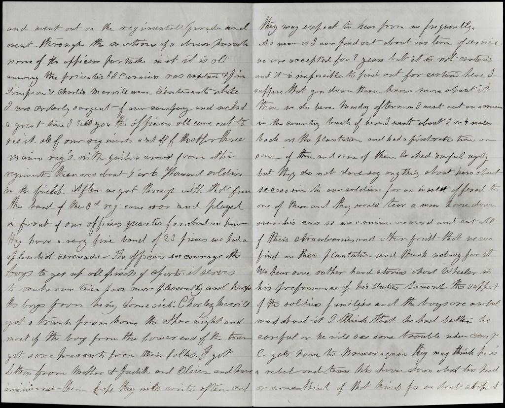 Monday afternoon I went out on a cruise in the country back of here. I went about three or four miles back on the plantation and had a first rate time on some of them and some of them looked awful ugly, but they do not dare say anything about here about secession to our soldiers for an insult offered to one of them and they would tear a man’s house down over his ears. So we cruise around and eat all of their strawberries and other fruit that we can find on their plantations and thank nobody for it.