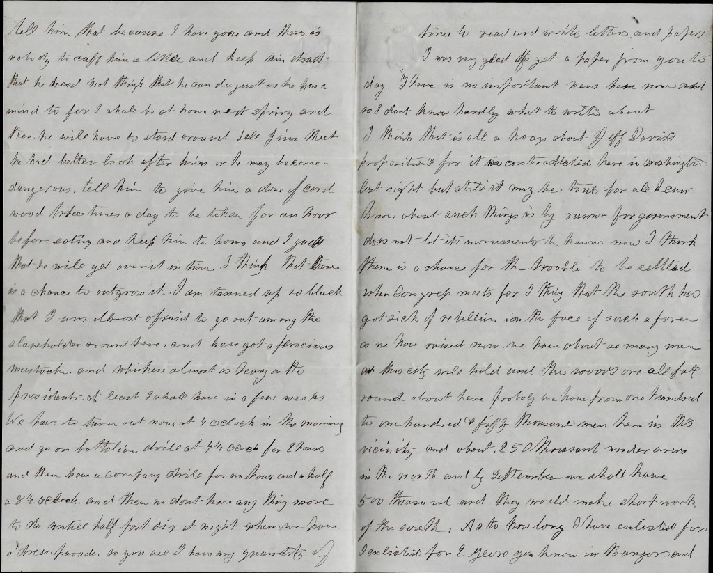 I have some faint hopes of seeing you all in the course of a month though it is very uncertain. Col. [Charles Davis] Jameson has resigned and Lt. Col. [Charles W.] Roberts is in command at present. I can think of nothing that will interest you further more than you can see in the papers. Please tell Martha I send my best respects to herself and family. Tell George he may thank his stars he is so well off. He don’t know what hard times are. He has not learned to eat hard bread and cold water yet and I hope he never will be brought to it.