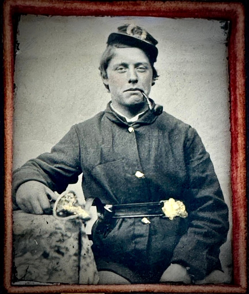 I could not find an image of Drummond but here is one of Humphrey Blaisdell who served in Co. G, 2nd Maine Infantry. He was wounded at Bull Run and taken prisoner; exchanged about mid-August. Note that he is wearing the “cadet grey” cap, frock coat and pants. (Ron Field Collection)