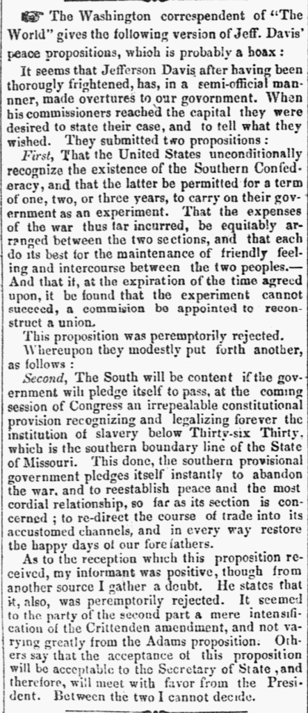 I think that is all a hoax about Jeff Davis’s propositions for it is contradicted here in Washington last night, but still it may be true for all I can know about such things is by rumor for government does not let its movements be known now. I think there is a chance for the trouble to be settled when Congress meets for I think that the South has got sick of rebellion in the face of such a force as we have raised now. We have about as many men in this city [will] hold and the rooms are all full round about here. Probably we have one hundred to one hundred and fifty thousand men here in this vicinity and about 250 thousand under arms in the North and by September we shall have 500 thousand and they would make short work of the South.