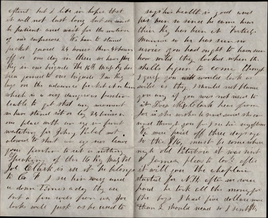 Speaking of the 16th Regt. Mass. Volunteers, Joe Clark is in it. He belongs to Co. F. I see him every and a dozen times a day. They are but a few rods from us. Joe looks well—just as he used to. Says his health is good and has been so since he came here. Their regiment has been at Fortress Monroe so he has seen no service. You had ought to have seen how wild they looked when the shells begun to come through. I guess you would look as wild as they. I should not blame you any if you was not used to it. Does Miss Clark hear from Joe? If she wishes to send word, she can send through you for I see him very often.