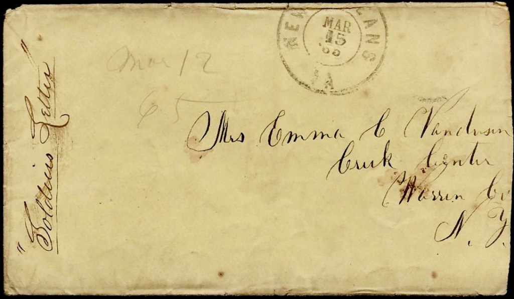 One of the letters was written by Thomas Crosby who was drafted into Co. M and who also died at the US Army General Hospital in New Orleans. His death occurred on 22 September 1864. The other letter was written by someone named “M. L. Shipman” who was not in the same regiment; in fact, he may not have even been in the military service. He may have been a civilian volunteer in the hospital. I have transcribed both letters as written without corrections to spelling or grammar. This is not my custom as it makes searching for key words less successful on the internet but there is little in these letters that lend themselves to searches.