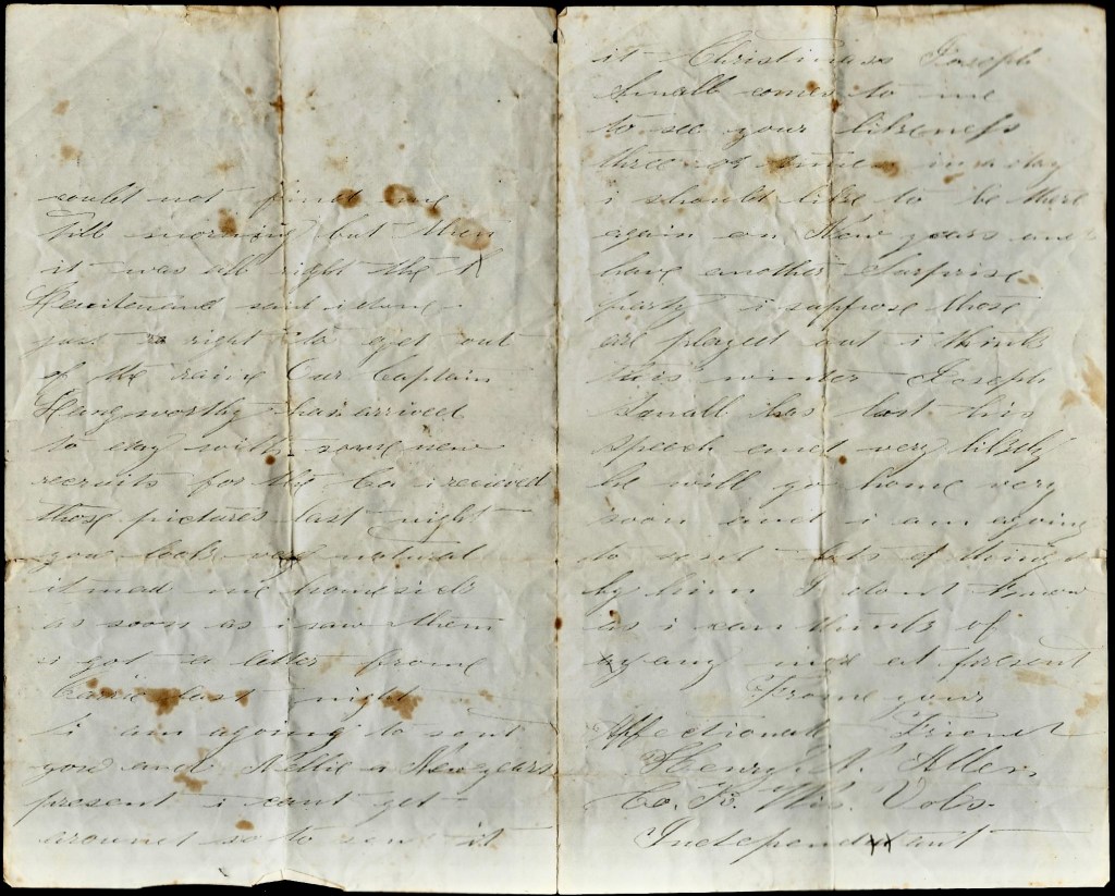 My dear sister, I thought I had finished on the last half sheet but I think of a thousand things more to say and I must mention a few of them. My health is now pretty good and I shall leave the hospital by the middle of next week, I think. So when you get this, you may consider me as fit for duty. I may possibly be mistaken about going away and so you may direct your letter as before and if I am gone, it will be forwarded to me. I am now on the last three months of my three years term of service. That will soon be gone but whether I shall then return to Wisconsin, I can’t tell. I am very anxious to see you and all the rest of the family but you know I wish to go to school two or three years and I think I can do better in New England than Wisconsin and I have not money to spend in traveling for pleasure. I don’t know yet what I will do but must make up my mind soon. I received a letter from Robert last night. It was rather strange that I.. [missing page]