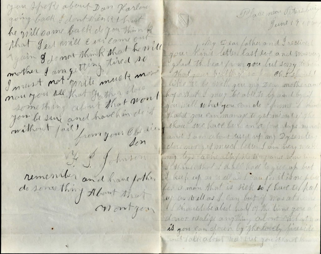 I received your kind letter last eve and was very glad to hear from you but sorry to hear that your health is so poor. Oh, I should like to be with you, my dear Mother and hope that I may be able to by and by. If you will [do] what you can do for me, I think that you can manage to get me out of the show. We have been on a four days march and I am about used up, My dysentery does not get much better. I am very well. My leg aches all of the time and sometimes I think that I shall have to give it up but I keep up as well as I can for it is no place for a man that is sick, so I have to keep up as well as I can. But if I was at home, I should be abed half of the time. You at [home] do not realize anything about what war is. You can [sit] down by the lovely fireplace and talk about war, but you do not know anything about war when you lay on the field with dead Rebs and see the wounded go by on the stretchers. Then you can talk about war.