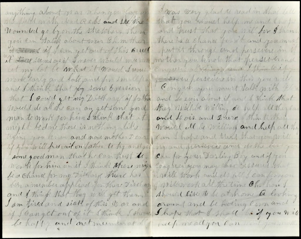 Oh Mother, if I can get out of this cruel war, it seems as if I never would murmur, let my lot be what it would. I would work early and late and for small pay and I think that by some exertion that I could get my discharge if Father would do all he can and get some good man to work for him. I think that it might be done. There is nothing like trying, you know. And now Mother dear, if you will prevail on Father to try and get some good man that he can trust to work for him on it, I think there might be a chance for my discharge. There was been a number applied for their discharge and I think that they will get them. I am tired and sick of this war and if I can get out of it, I think I should be happy and not murmur at all.