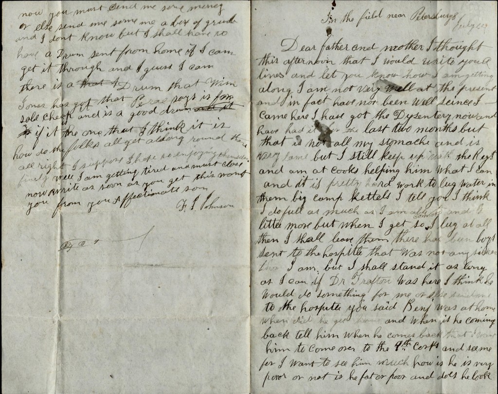 How do the folks all get along round there? All right I suppose. I hope so enjoying themselves. Well, I am getting tired and must close. Now write as soon as you get this, won’t you? From your affectionate son, — F. I. Johnson