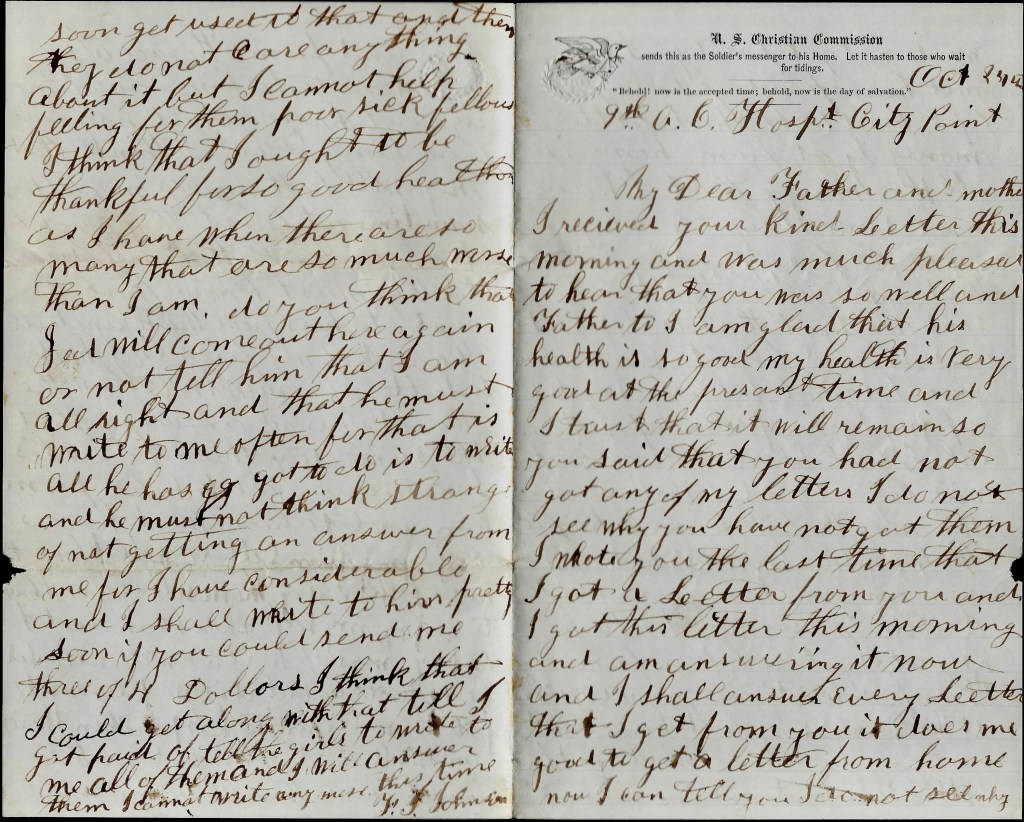 I received in your last letter a two dollar bill and I tell you, it done my soul good. But two dollars does not go very far here now I can tell you. I bought me a little butter and made me a little toast and I tell you it tasted good. Things are most high out here. If it was so you could send me a box, I should like [it] but I do not know as you could without costing considerable. But they say that a box will come right through straight to City Point and then come up on the teams, There has been boxes come. If you do not send a box. Please send me a five dollar bill and I will send you back as much more when we get paid off. They say we shall get paid now pretty soon and I shall send some home. I think you will get some anyhow on the allotment roll.