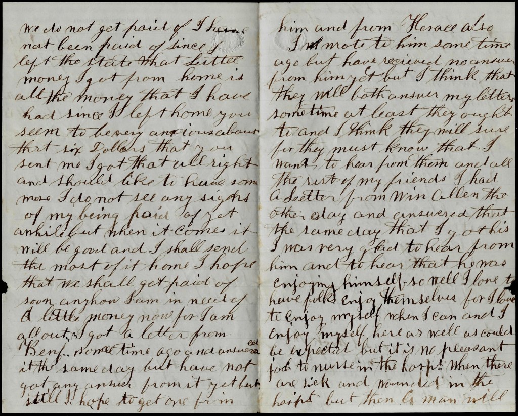 I got a letter from Benj. some time ago and answered it the same day but have not got an answer from it yet but still I hope o get one from him and from Horace also. I wrote to him some time ago but have received no answer from him but I think that they will both answer my letters sometime—at least they ought to. And I think they will sure for they must know that I want to hear from them and all the rest of my friends. I had a letter from Win Allen the other day and answered that the same day that I got his. I was very glad to hear from him and to hear that he was enjoying himself so well. I love to enjoy myself when I can and I enjoy myself here as well as could be expected but it is no pleasant job to nurse in the hospital when there are sick and wounded in the hospital. But then a man will soon get used to that and then they do not care anything about it. But I cannot help feeling for them poor sick fellows. I think that I ought to be thankful for so good health as I have where there are so many that are so much worse than I am.