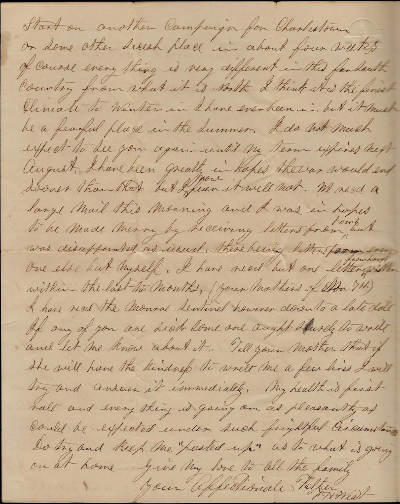 We are now camped on the banks of the river two miles above the city and expect to start on another campaign for Charleston or some other secede place in about four weeks. Of course everything is very different in this far south country from what it is North. I think it is the finest climate to winter in I have ever been in but it must be a fearful place in the summer. I do not much expect to see you again until my term expires next August. I have been greatly in hopes the war would end sooner than that but I fear now it will not.