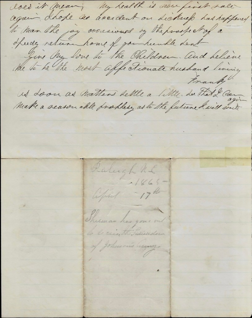 Give my love to the children. Hoping to hear from you every day, I remain, my dear wife, as ever your very devoted husband, — Frank