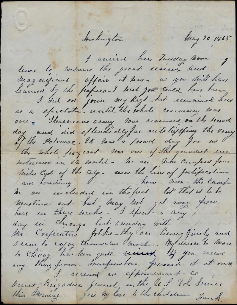We are expecting to get off on a new campaign in the course of the next ten days and anticipate a much rougher time than we had in coming here. The past week has been spent in Grand Reviews of a Corps at a time by General Sherman. These reviews take place inn the streets of Savannah and attracted large crowds of spectators. The new year commences with splendid prospects for the success of our army and the speedy termination of the rebellion. I suppose you hear of everything that happens here through the newspapers. We have got the particulars of Thomas’s great victory in Tennessee [Battle of Nashville] which has so effectually cleaned out Hood. I expect that Caldwell is cleaned out also. I have not heard from him since the 17th of November since when he could not have had an opportunity to do anything. He had got fifty-seven bales of cotton into Nashville which will more than pay the outlay.