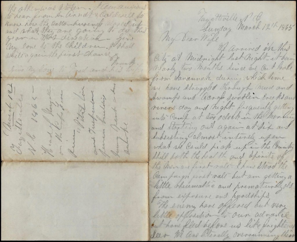 We arrived in this city at midnight last night, it being nearly two months since we cut loose from Savannah during which time we have struggled through mud and swamps and across swollen creeks and rivers day and night, frequently getting into camp at 2 o’clock in the morning and starting out again at 6, and subsisting almost entirely upon what we could pick up in the country. Still both the health and spirits of the men are first rate. I have stood the campaign first rate but am getting a little rheumatic and prematurely old from exposure and hardships. The enemy have offered by very little opposition to our advance but have fled before us like frightened deer. We are literally overrunning their whole country.